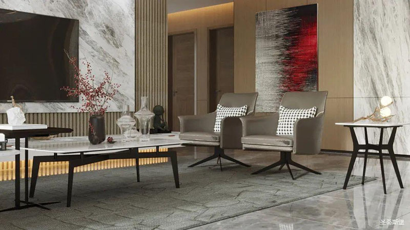 纯美的线条,沉稳的色泽,为空间定下了低调而华丽的基调。浑然天成的实木与岩板纹理,让角几荡漾出一幅“水光潋滟”的泼墨油画。三两红枝点缀,表达着“枝头并蒂祝吉祥”的美好祝愿。光影透过极简金属几脚,折射出一种隐藏的优雅气质。大小、高低不一的天然材质角几组合在一起,时尚又个性,不仅便于移动,还表现的灵活且轻巧。