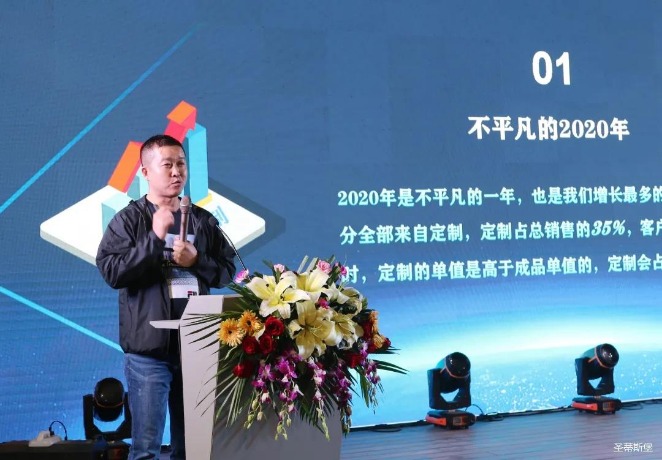 华灯璀璨的开场仪式,点燃了现场如火如荼的气氛。今年会集团集团营销总经理陈玉伟先生对晚会进行了主题发言,他对2020年的营销工作进行了总结,并着重从营销工作部署、重点项目开展、产品整合、拎包帮扶、渠道运营和移动+定制整装优势等方面对2021年的营销工作做了全面的统筹规划。同时,他还讲解了“美国梦凯莎床垫”新品的产品工艺、市场优势、产品定位,使经销商对我们的新产品拥有更深入的认识和了解。